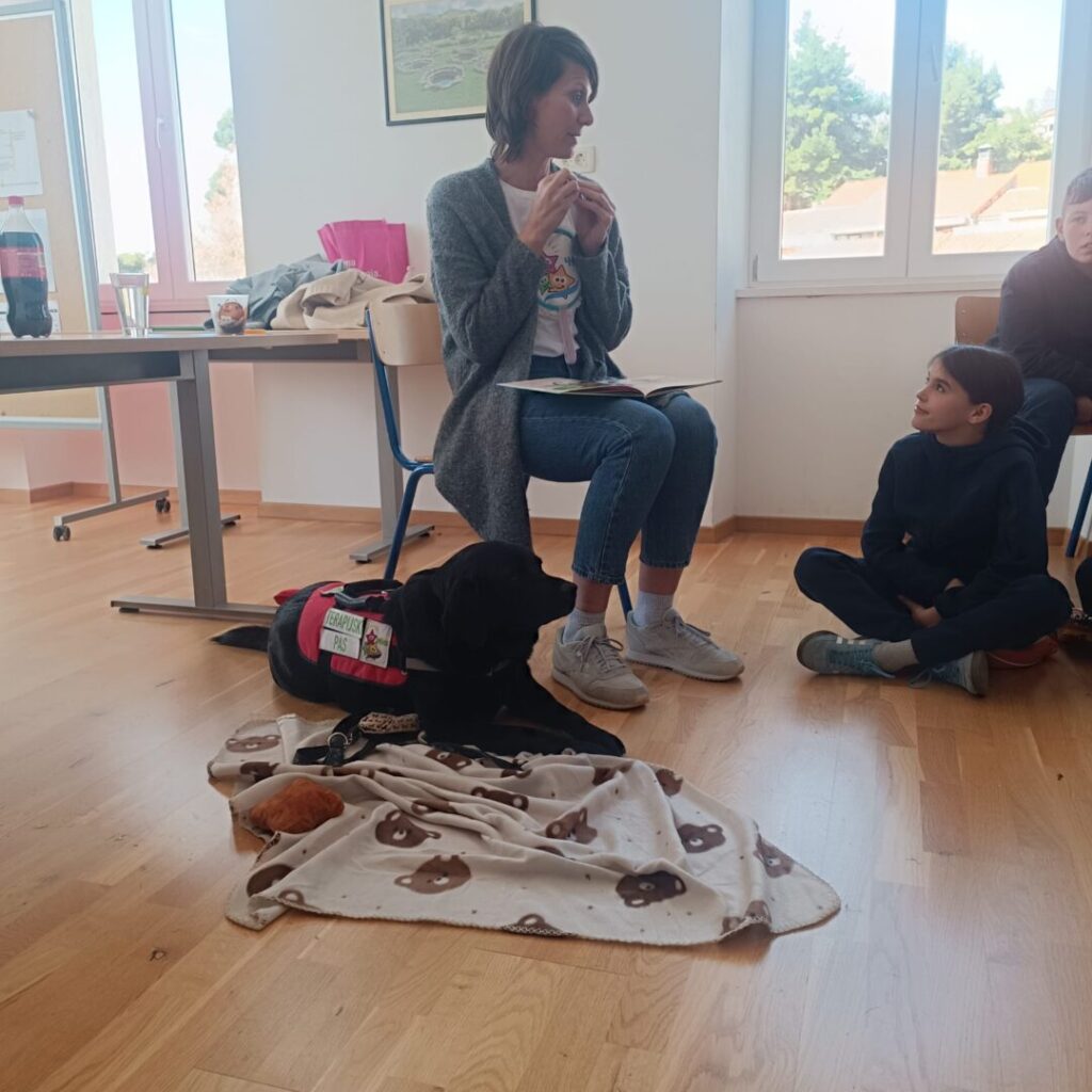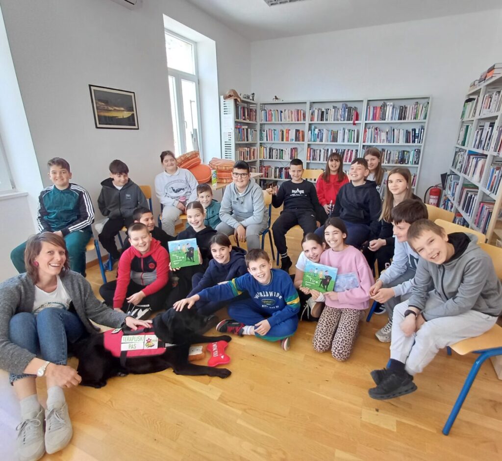 Zajedno smo čitali slikovnicu „Pas Tira pomaže djeci“, koja na poticajan i pristupačan način približava djeci važnost čitanja. Poseban doživljaj bio je i interaktivni dio radionice u kojem su učenici znakovima komunicirali s Tirom. Pas je na svaku pravilno izvršenu naredbu bio nagrađen slasticom, što je dodatno motiviralo djecu na sudjelovanje.